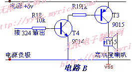 上图为照明电路,如做报警电路,则可与电路B组合,只要有人在监测范围内移动将触发报警,高响度喇叭发出强力警报,吓跑歹徒。图B电路一定要是双管组合,这样才能带动电流较大的高响度喇叭电路HY,将前图中的R16用SCR去掉,LM324的7脚接到图B中的相应处。图B中的R19应改为680欧,此电源也不能共用上图的电源了,而要另用变压器降压电源或另配直流电源。该喇叭是专用报警喇叭,一般用四声集成块做成的,接上电源就能发出高dB响声,无限电子制作网敬告初学者,千万不能直接接上一般的收录音喇叭,否则一定会被烧毁的。